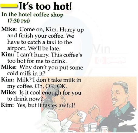 Mike: Come on, Kim. Hurry up and finish your coffee. We have to catch a taxi to the airport. We’ll be late.