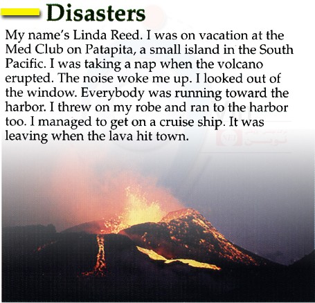 My name’s Linda Reed. I was on vacation at the Med Club on Patapita, a small island in the South Pacific. I was taking a nap when the volcano erupted. The noise woke me up. I looked out of the window. Everybody was running toward theharbor. I threw on my robe and ran to the harbor too. I managed to get on a cruise ship. It was leaving when the lava hit town.