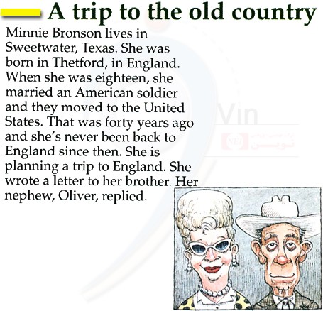 Minnie Bronson lives in Sweetwater, Texas. She was born in Thetford, in England. When she was eighteen, she married an American soldier and they moved to the United States. That was forty years ago and she’s never been back to England since then. She is planning a trip to England. She wrote a letter to her brother. Her nephew, Oliver, replied.