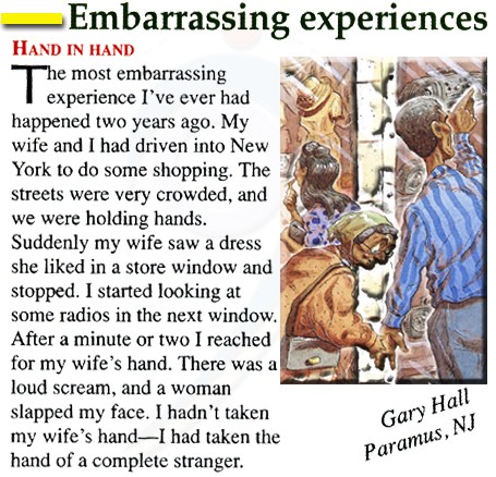 The most embarrassing experience I’ve ever had happened two years ago. My wife and I had driven into New York to do shopping. The streets were very crowded, and we were holding hands. Suddenly my wife saw a dress she liked in a store window and stopped. I started looking at some radios in the next window. After a minute or two I reached for my wife’s hand. There was a loud scream, and a woman slapped my face. I hadn’t taken my wife’s hand – I had taken the hand of a complete stranger.