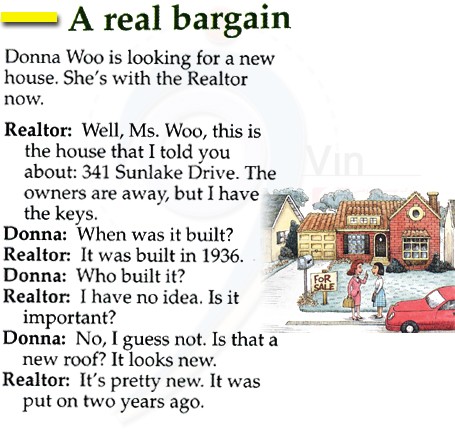Realtor: Well, Ms. Woo, this is the house that I told you about: 341 Sunlake Drive. The owners are away, but I have the keys.