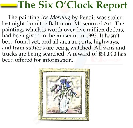 The Painting Iris Morning by Penoir was stolen last night from the Baltimore Museum of Art. The painting, which is worth over five million dollars, had been given to the museum in 1993. It hasn’t been found yet, and all area airports, highways, and train stations are being watched. All vans and trucks are being searched. A reward of $50,000 has been offered for information.