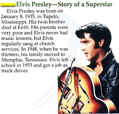 Elvis Presley was born on January 8, 1935, in Tupelo, Mississippi. His twin brother died at birth. His parents were very poor and Elvis never had music lessons, but Elvis regularly sang at church services. In 1948, when he was thirteen, his family moved to Memphis, Tennessee. Elvis left school in 1953 and got a job as truck driver.
