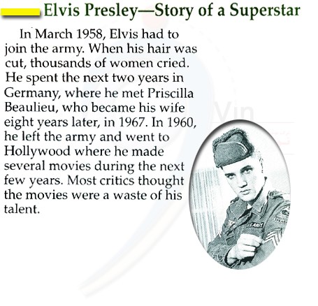 In March 1958, Elvis had to join the army. When his hair was cut, thousands of women cried. He spent the next two years in Germany, where he met Priscilla Beaulieu, who became his wife eight years later, in 1967. In 1960, he left the army and went to Hollywood where he made several movies during the next few years. Most critics thought the movies were a waste of his talent.