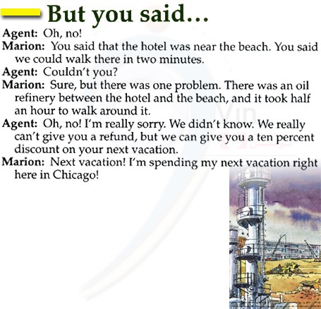 Marion: You said that the hotel was near the beach. You said we could walk there in two minutes.
