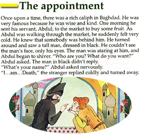 Once upon a time, there was a rich caliph in Baghdad. He was very famous because he was wise and kind. One morning he sent his servant, Abdul, to the market to buy some fruit. As Abdul was walking through the market, he suddenly felt very cold. He knew that somebody was behind him. He turned around and saw a tall man, dressed in black. He couldn’t see the man’s face, only his eyes. The man was staring at him, and Abdul began to shiver. “Who are you? What do you want?” Abdul asked. The man in black didn’t reply.